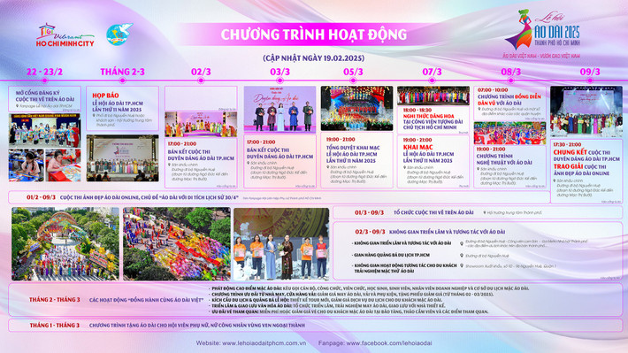 Lễ hội Áo dài TP.HCM năm 2025 hứa hẹn mang đến một chuỗi hoạt động phong phú, đa dạng, kết hợp giữa nghệ thuật, trình diễn thời trang và các cuộc thi hấp dẫn: