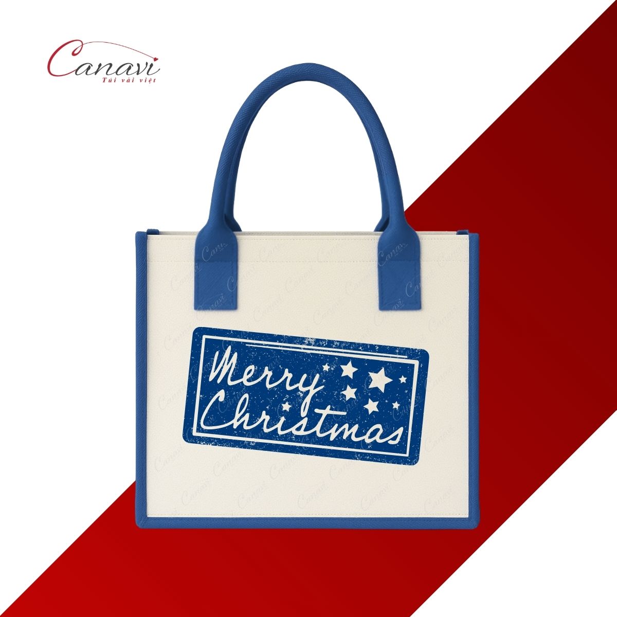 Mặt trước túi in thông điệp “Merry Christmas” theo dạng dấu mộc nghệ thuật, gam màu xanh đồng bộ với quai xách, tạo điểm nhấn thu hút mà vẫn giữ sự thanh lịch, phù hợp làm quà tặng doanh nghiệp, sự kiện Noel, hội nhóm, cửa hàng…