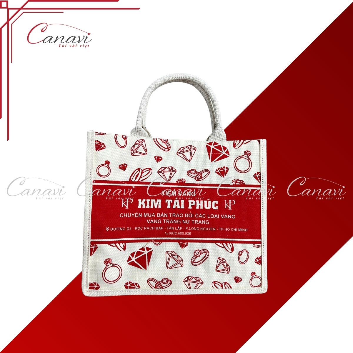Nếu cửa hàng đang tìm một mẫu túi vải quà tặng Tết vừa sang trọng, vừa độc đáo nhưng vẫn đảm bảo sự bền bỉ khi sử dụng, túi vải đay quà tặng Tết TVQT20 chính là lựa chọn lý tưởng. Với thiết kế nổi bật gam đỏ trắng, kết hợp họa tiết trang sức tinh xảo, mẫu túi này phù hợp đặc biệt với các cửa hàng vàng bạc, trang sức, phụ kiện cao cấp muốn tạo dấu ấn chuyên nghiệp trong mùa Tết.